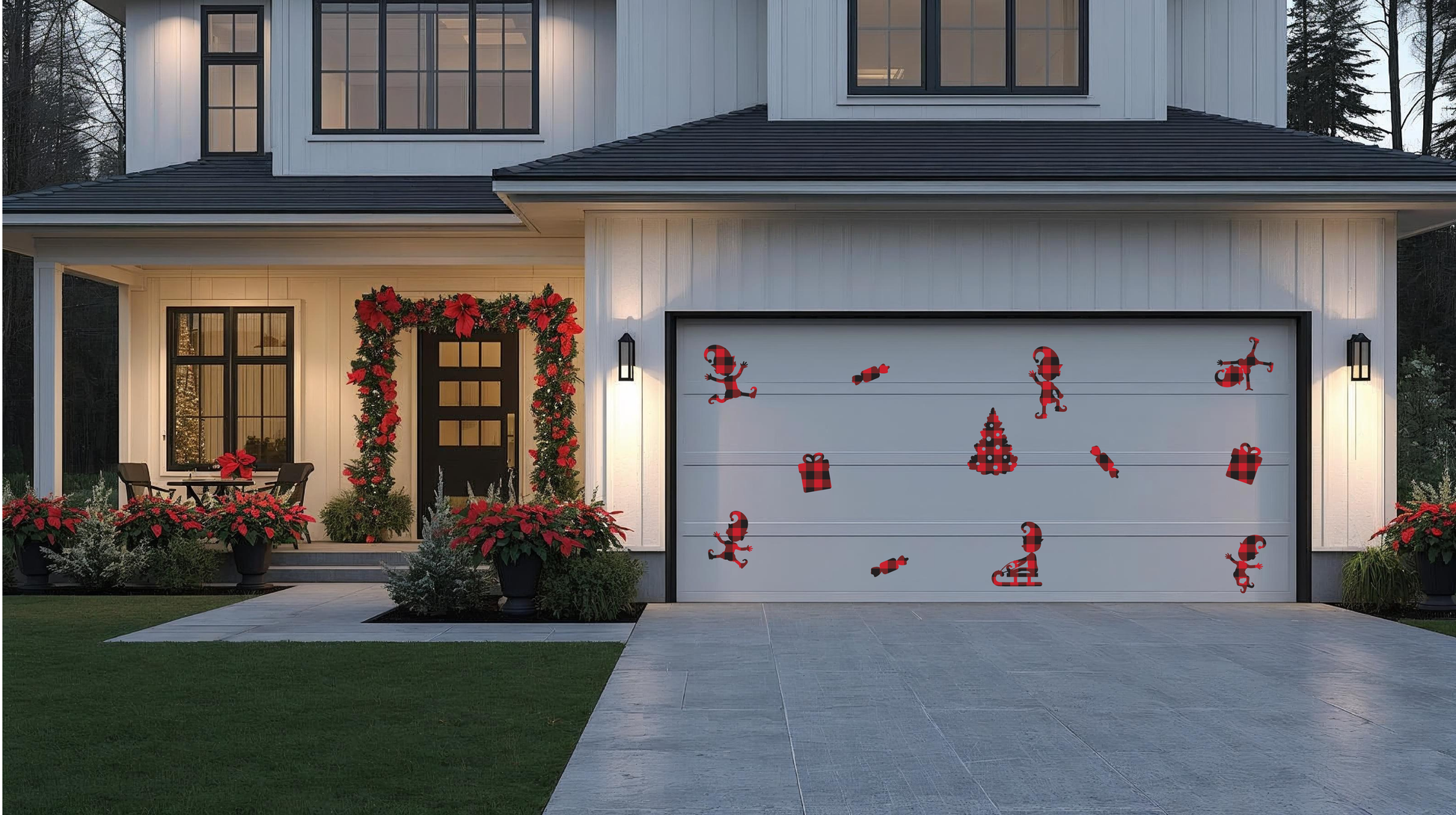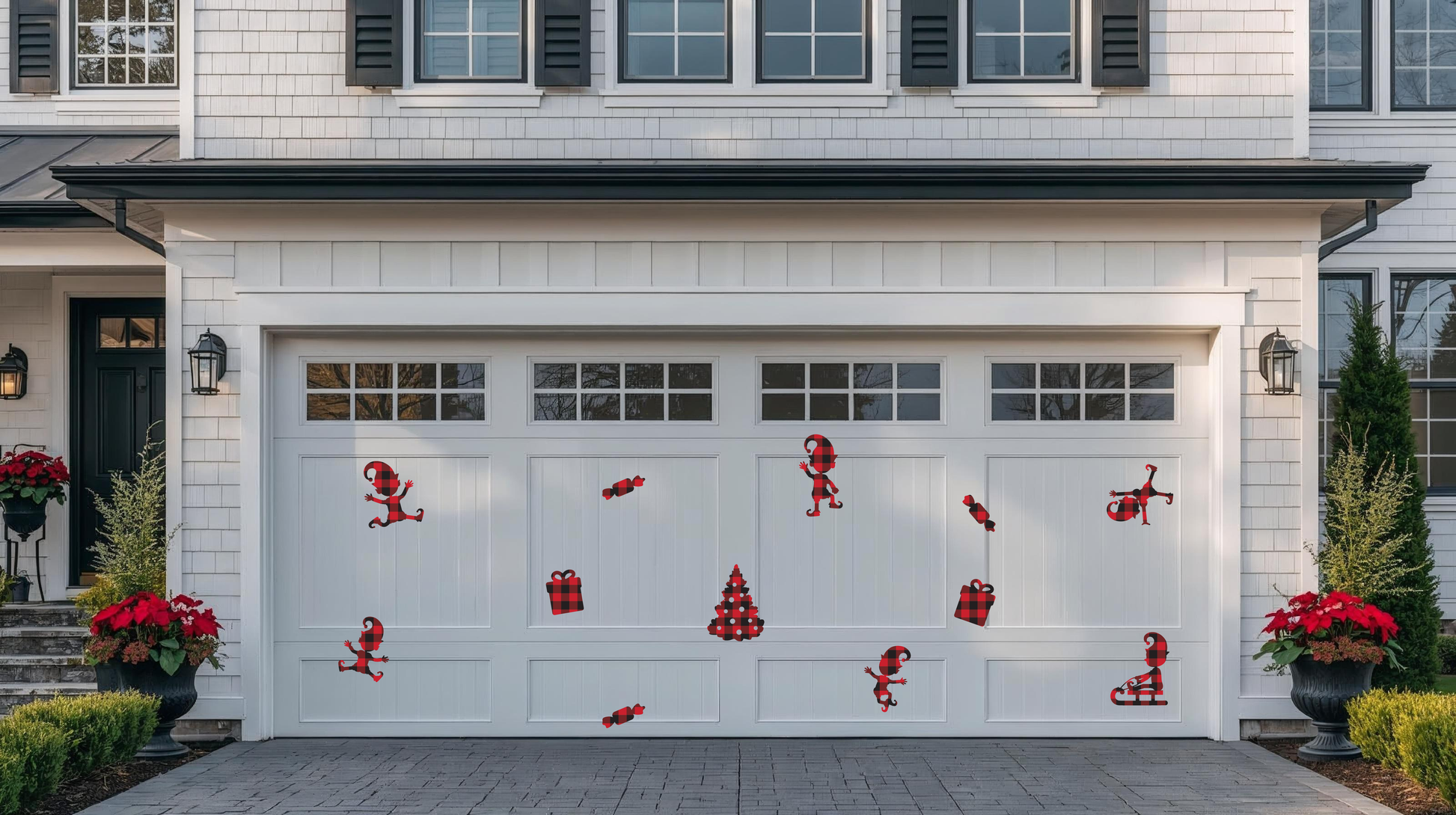 dancing elves, christmas elves, candy elves, buffalo plaid, holiday elves, presents, garage door decor, school locker, fridge decor, playful elves, jumping elves, mischievious elves, funny elves